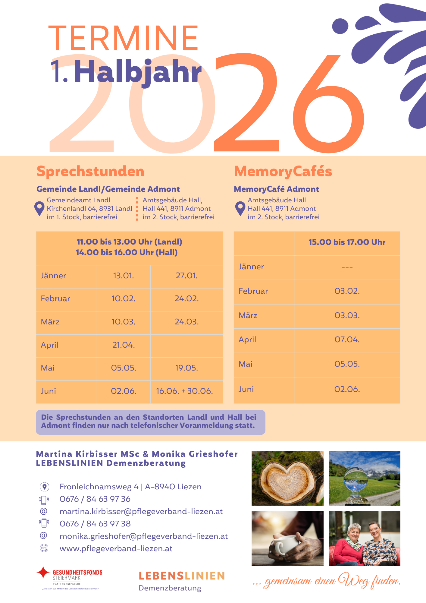 Untenstehend finden Sie die Termine zur Demenzberatung und zu den MemoryCafés der LEBENSLINIEN.